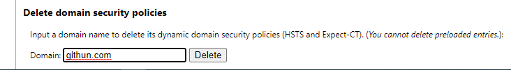正常理解到了这一步,删掉了访问域名的的域安全策略,理论上是可以访问了,但是很多人可能仍然无法访问。删除安全策略的上面一行说了 You cannot delete preloaded entries,就是你不能删除预加载的安全策略。很不幸再次查询Query HSTS/PKP domain发现域名还在,基本上就是预加载了,难道我们没办法访问了吗?