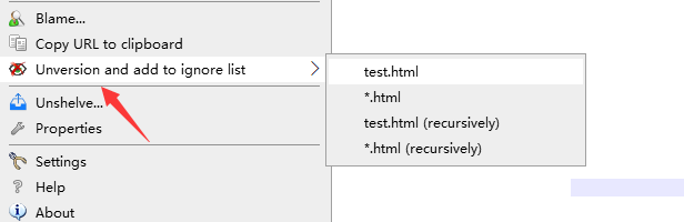上面我们忽略的文件都是还未提交过的新文件,如果是已经提交到服务器的文件,添加忽略时稍微有点不一样,这时候提示多了Unversion,这表示取消版本管理并且添加到忽略列表。