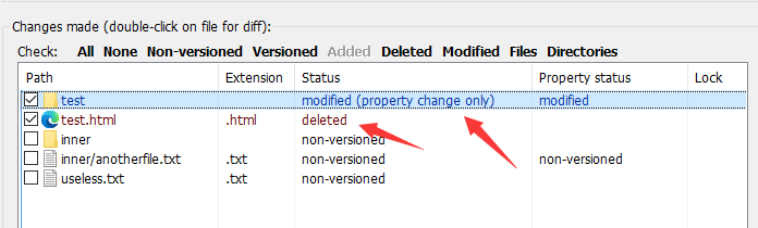 上面我们把test.html文件取消了版本管理并且添加到忽略列表了,这时候的提交变动我们看下: