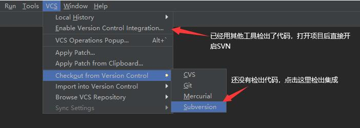 开启 svn 分两种情况,还未检出代码的,Pycharm 里直接检出就继承好了。
