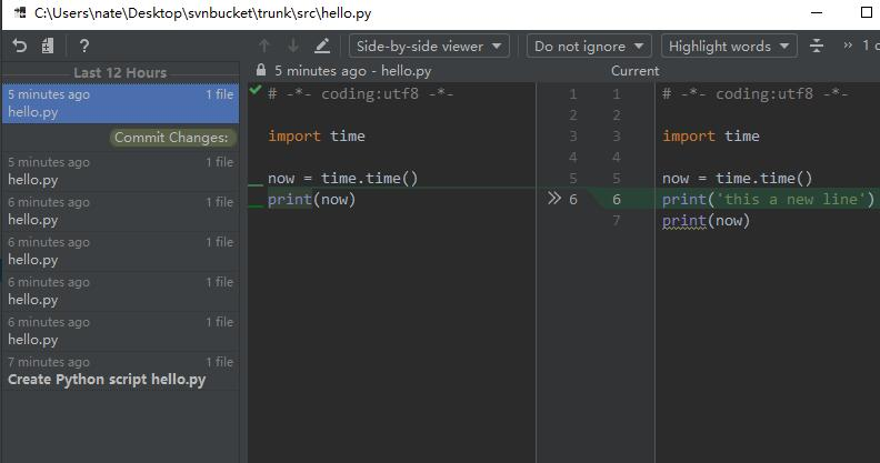 Pycharm还自己有一个本地修改记录,如下图,从我创建hello.py,修改内容,到提交到svn,每次的修改都有记录,非常方便。