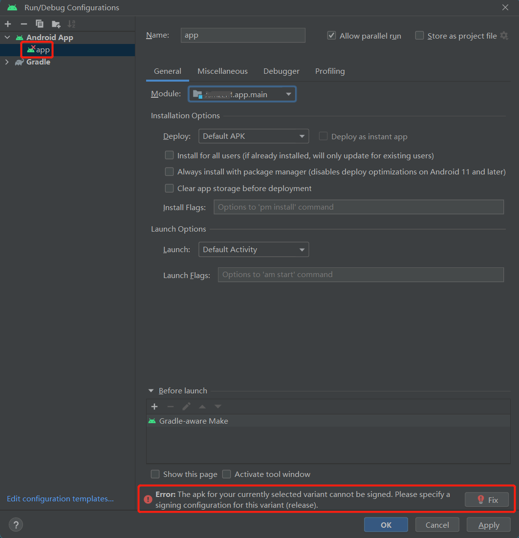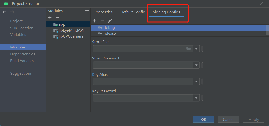 点击上图右下角的Fix按钮即可进入Signing Configs配置界面,如下图所示:
