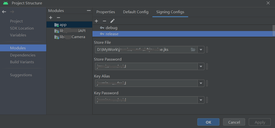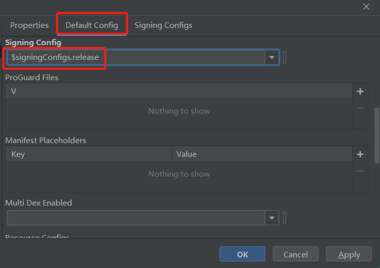 在Default Config选项卡中设置刚刚配置的release签名配置:$signingConfigs.release