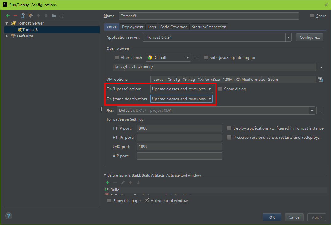 - On update action:当发现更新时的操作 选择Update classes and resources