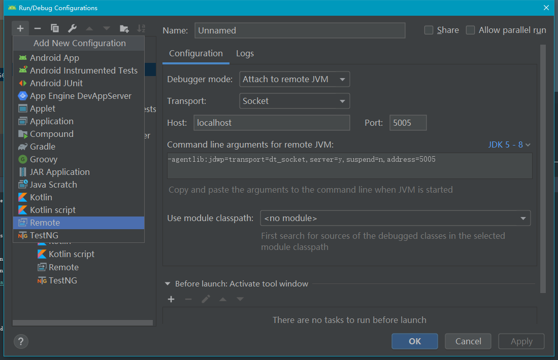 然后在AS->Run->EditConfigurations,然后点击左上角的+号,添加一个Remote,然后直接点击apply即可.