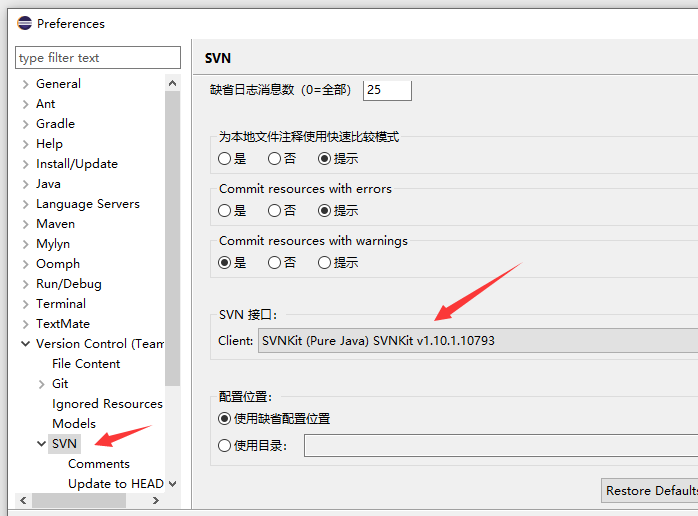 在 Eclipse->window->preference->team->svn 中将 svn 接口设定为 svnkit。